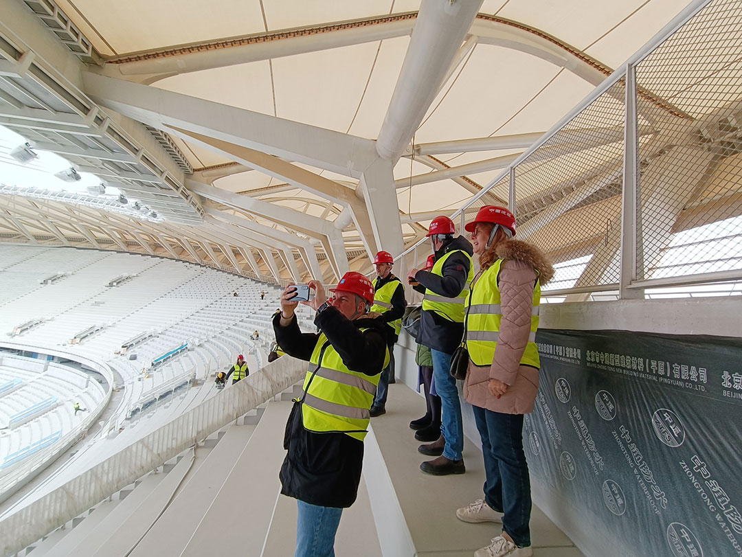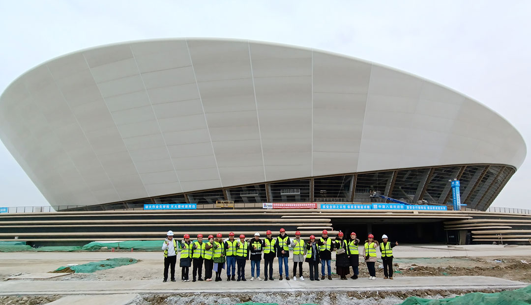 1月29日,代表团驱车前往无锡奥体中心,开启第二站实地考察。作为环太湖区域稀有的临湖综合体育场馆群,无锡奥体中心以“白鹭振翅”为设计理念,其造型设计和承建,堪称钢膜结构应用的经典力作。